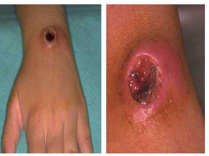 Клиника: l Инкубационный период – от нескольких часов до 14 дней, чаще 2 – 3 дня l Язва с темным, б/б дном, окруженная воспалительным валиком, с развитием отека клетчатки, отделямое язвы серозное или геморрагическое, вокруг язвы развиваются «дочерние везикулы» , которые через 1 -2 дня вскрываются увеличивая размеры. l Выражены симптомы интоксикации(лихорадка, головная боль, наруш. аппетита, растр – во сна) l Лимфаденит, держится до 2 -4 нед. l Через 2 -2, 5 нед. образуется струп темного цвета