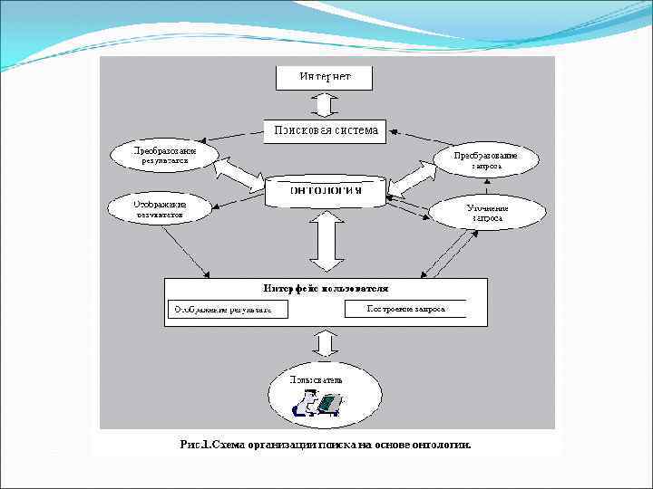 ПРИМЕНЕНИЕ ОНТОЛОГИИ ДЛЯ ОРГАНИЗАЦИИ ПОИСКА В INTERNET При обращении к поисковой системе пользователь должен иметь возможность получить в ответ ресурсы релевантные смыслу запроса, их поиск должен быть семантически ориентированным. Для этого средства поиска соответствующей запросу информации предлагается организовать на основе онтологии, содержащей описания семантики ресурсов.