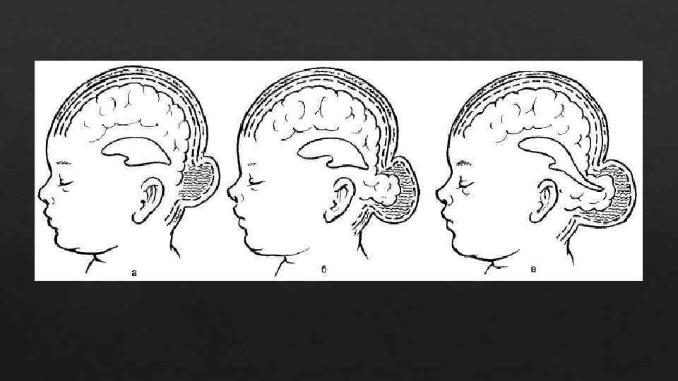 Пороки развития головного мозга Гидроцефалия — заболевание, характеризующееся избыточным скоплением цереброспинальной жидкости в желудочковой системе головного мозга в результате затруднения её перемещения от места секреции (желудочки головного мозга) к месту абсорбции в кровеносную систему (субарахноидальное пространство) (окклюзионная гидроцефалия), либо в результате нарушения абсорбции (арезорбтивная гидроцефалия)
