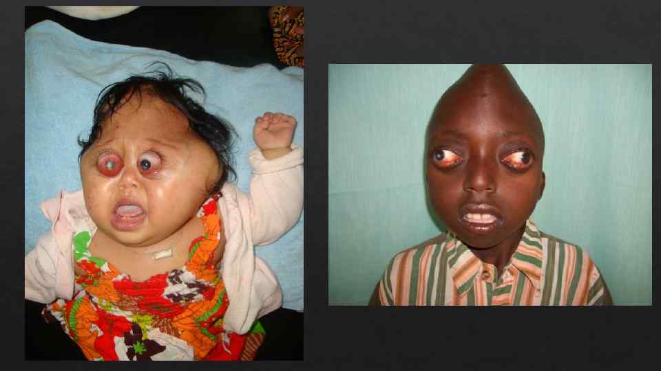 Синдром Крузона ЧЕРЕПНО-ЛИЦЕВОЙ ДИЗОСТОЗ Раннее асинхронное развитие черепных швов приводит к своеобразной форме черепа с характерными изменениями лицевого скелета: — череп уменьшен в размерах; — лоб скошен, надбровные дуги недоразвиты; — глаза широко расставлены, выражен экзофтальм; — нос имеет форму «клюва попугая» ; — верхняя губа короткая; — наблюдается гипоплазия верхней и относительный прогнатизм нижней челюсти.
