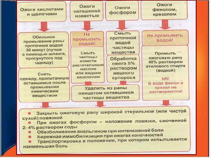 Алгоритм первой помощи при ожоговой травме Задача Действие Прекратить действие высокой температуры и препятствовать доступу воздуха Сбить пламя, накрыть одеялом облить водой, засыпать песком если загорелась одежда Остановить нарастание гипертермии обожженного места Охлаждать холодной водой 15 -20 мин Предупредить сдавление тканей Снять часы, кольца и т. д Предупредить инфекцию Наложить сухую асептическую повязку Предупредить шок и обезвоживание Обильное питье теплой воды с солью и содой (по 1 ст. л. на 1 л Обезболить 2 таб. анальгина, аспирин, димедрол, корвалол, валидол Покой, согреть, быстро доставить в ожоговый центр Уложить, накрыть одеялом