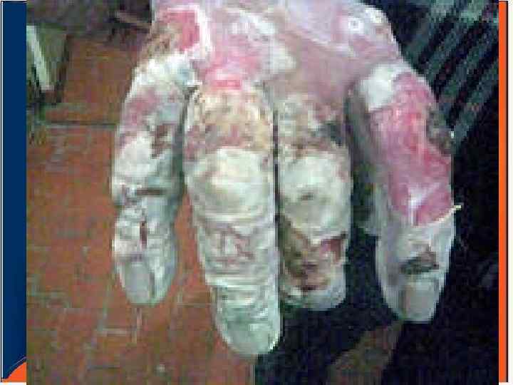 3 -я степень отморожения • возникает при охлаждении ткани ниже 270 С. • местно кожа холодная, • потеря чувствительности, • цвет сине-багровый. • пузыри грязно-бурого цвета, • некроз (отмирание) ткани, поражены все слои кожи. • возникают язвы, после заживления остаются грубые рубцы. • Заживление идет более 3 -х месяцев. 4 -я степень отморожения - некроз (смерть) кожи и всех глубоких слоев тканей (мышц, костей).