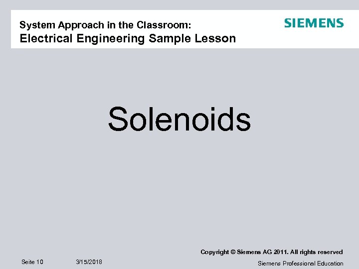 System Approach in the Classroom: Electrical Engineering Sample Lesson Solenoids Copyright © Siemens AG 2011. All rights reserved Seite 10 3/15/2018 Siemens Professional Education