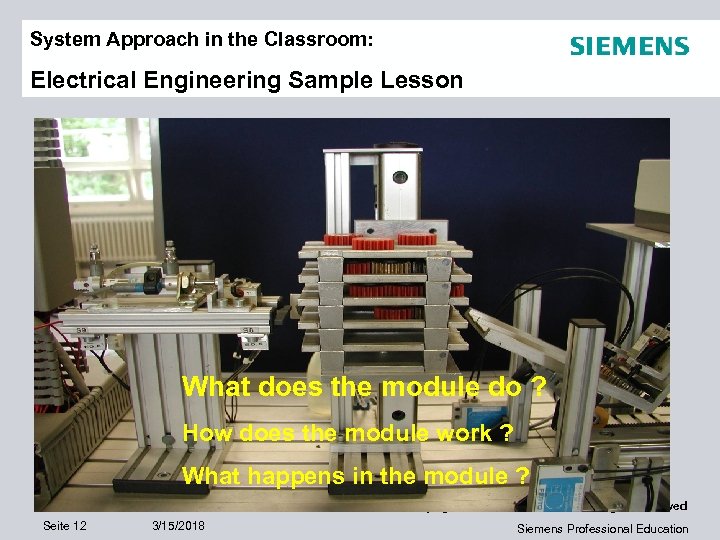 System Approach in the Classroom: Electrical Engineering Sample Lesson What does the module do ? How does the module work ? What happens in the module ? Copyright © Siemens AG 2011. All rights reserved Seite 12 3/15/2018 Siemens Professional Education