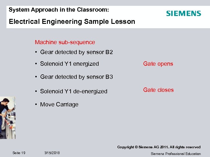 System Approach in the Classroom: Electrical Engineering Sample Lesson Machine sub-sequence • Gear detected by sensor B 2 • Solenoid Y 1 energized Gate opens • Gear detected by sensor B 3 • Solenoid Y 1 de-energized Gate closes • Move Carriage Copyright © Siemens AG 2011. All rights reserved Seite 19 3/15/2018 Siemens Professional Education