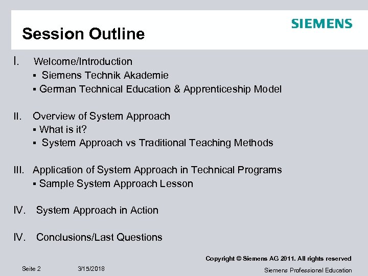 Session Outline I. Welcome/Introduction ▪ Siemens Technik Akademie ▪ German Technical Education & Apprenticeship Model II. Overview of System Approach ▪ What is it? ▪ System Approach vs Traditional Teaching Methods III. Application of System Approach in Technical Programs ▪ Sample System Approach Lesson IV. System Approach in Action IV. Conclusions/Last Questions Copyright © Siemens AG 2011. All rights reserved Seite 2 3/15/2018 Siemens Professional Education