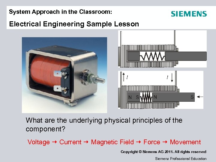 System Approach in the Classroom: Electrical Engineering Sample Lesson What are the underlying physical principles of the component? Voltage Current Magnetic Field Force Movement Copyright © Siemens AG 2011. All rights reserved Siemens Professional Education