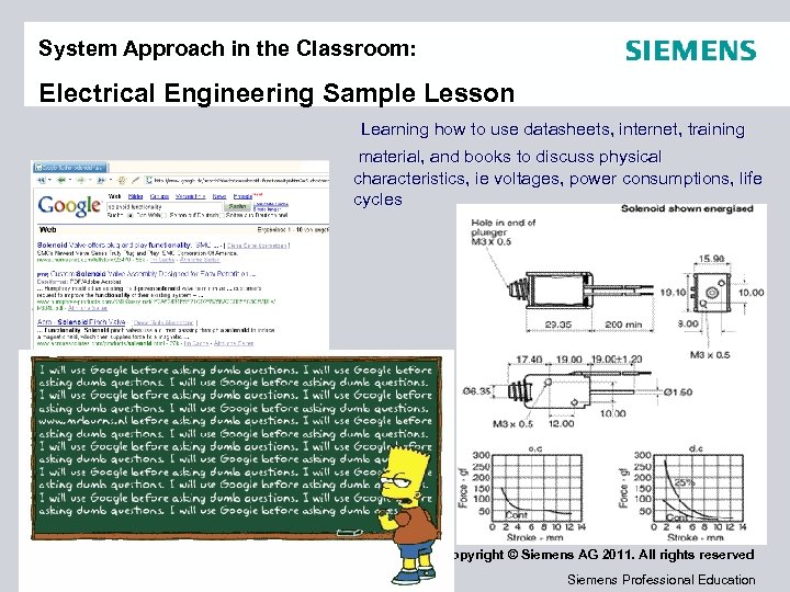 System Approach in the Classroom: Electrical Engineering Sample Lesson Learning how to use datasheets, internet, training material, and books to discuss physical characteristics, ie voltages, power consumptions, life cycles Copyright © Siemens AG 2011. All rights reserved Siemens Professional Education