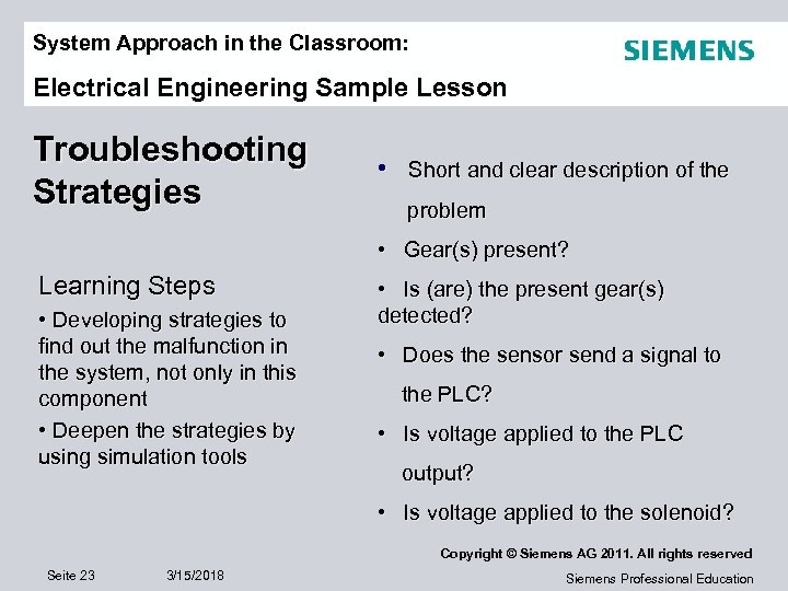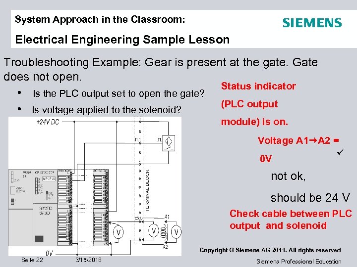 System Approach in the Classroom: Electrical Engineering Sample Lesson Troubleshooting Example: Gear is present at the gate. Gate does not open. Status indicator • Is the PLC output set to open the gate? (PLC output • Is voltage applied to the solenoid? module) is on. Voltage A 1 A 2 = 0 V not ok, should be 24 V Check cable between PLC output and solenoid Copyright © Siemens AG 2011. All rights reserved Seite 22 3/15/2018 Siemens Professional Education