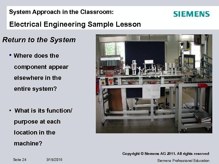 System Approach in the Classroom: Electrical Engineering Sample Lesson Return to the System • Where does the component appear elsewhere in the entire system? • What is its function/ purpose at each location in the machine? Copyright © Siemens AG 2011. All rights reserved Seite 24 3/15/2018 Siemens Professional Education