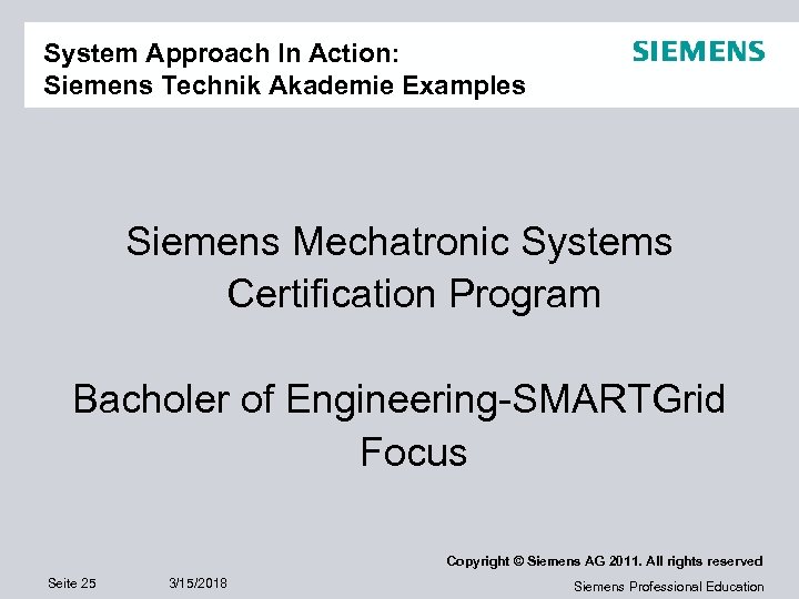 System Approach In Action: Siemens Technik Akademie Examples Siemens Mechatronic Systems Certification Program Bacholer of Engineering-SMARTGrid Focus Copyright © Siemens AG 2011. All rights reserved Seite 25 3/15/2018 Siemens Professional Education
