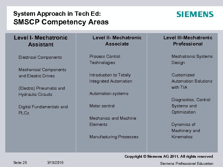 System Approach in Tech Ed: SMSCP Competency Areas Level I- Mechatronic Assistant Electrical Components Mechanical Components and Electric Drives (Electro) Pneumatic and Hydraulic Circuits Digital Fundamentals and PLCs Level II- Mechatronic Associate Level III-Mechatronic Professional Process Control Technologies Mechatronic Systems Design Introduction to Totally Integrated Automation Customized Automation Solutions with TIA Automation systems Diagnostics, Control Systems and Optimization Motor control Mechanics and Machine Elements Manufacturing Processes Dynamics of Machinery and Kinematics Copyright © Siemens AG 2011. All rights reserved Seite 28 3/15/2018 Siemens Professional Education