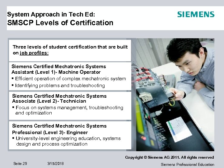 System Approach in Tech Ed: SMSCP Levels of Certification Three levels of student certification that are built on job profiles: Siemens Certified Mechatronic Systems Assistant (Level 1)- Machine Operator § Efficient operation of complex mechatronic system § Identifying problems and troubleshooting Siemens Certified Mechatronic Systems Associate (Level 2)- Technician § Focus on systems management, troubleshooting and optimization Siemens Certified Mechatronic Systems Professional (Level 3)- Engineer § University-level engineering education, systems design and process optimization Copyright © Siemens AG 2011. All rights reserved Seite 29 3/15/2018 Siemens Professional Education