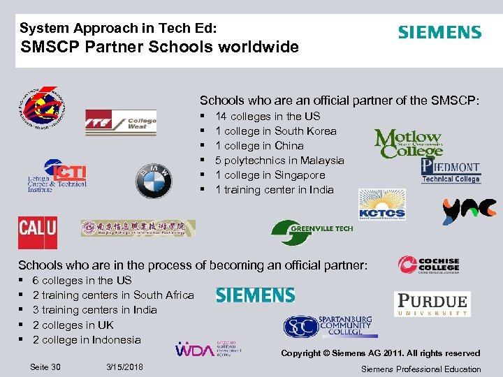 System Approach in Tech Ed: SMSCP Partner Schools worldwide Schools who are an official partner of the SMSCP: § § § 14 colleges in the US 1 college in South Korea 1 college in China 5 polytechnics in Malaysia 1 college in Singapore 1 training center in India Schools who are in the process of becoming an official partner: § § § 6 colleges in the US 2 training centers in South Africa 3 training centers in India 2 colleges in UK 2 college in Indonesia Copyright © Siemens AG 2011. All rights reserved Seite 30 3/15/2018 Siemens Professional Education