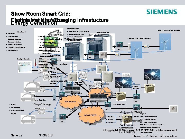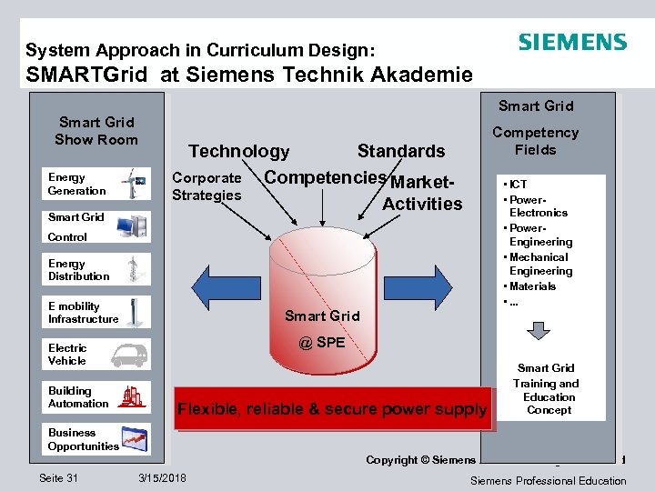 System Approach in Curriculum Design: SMARTGrid at Siemens Technik Akademie Smart Grid Show Room Energy Generation Smart Grid Competency Fields Technology Standards Corporate Competencies Market. Strategies Activities • ICT • Power. Electronics • Power. Engineering • Mechanical Engineering • Materials • . . . Control Energy Distribution E mobility Infrastructure Smart Grid @ SPE Electric Vehicle Building Automation Flexible, reliable & secure power supply Smart Grid Training and Education Concept Business Opportunities Copyright © Siemens AG 2011. All rights reserved Seite 31 3/15/2018 Siemens Professional Education