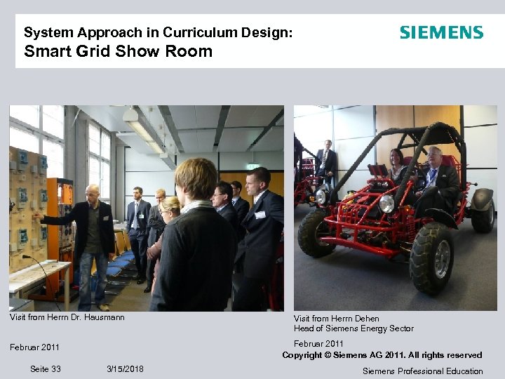 System Approach in Curriculum Design: Smart Grid Show Room Visit from Herrn Dr. Hausmann Februar 2011 Copyright © Siemens AG 2011. All rights reserved Februar 2011 Seite 33 Visit from Herrn Dehen Head of Siemens Energy Sector 3/15/2018 Siemens Professional Education