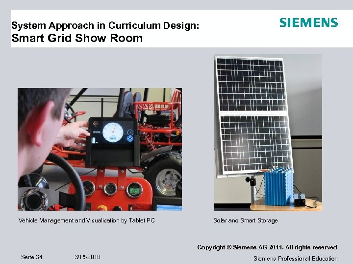 System Approach in Curriculum Design: Smart Grid Show Room Vehicle Management and Visualisation by Tablet PC Solar and Smart Storage Copyright © Siemens AG 2011. All rights reserved Seite 34 3/15/2018 Siemens Professional Education