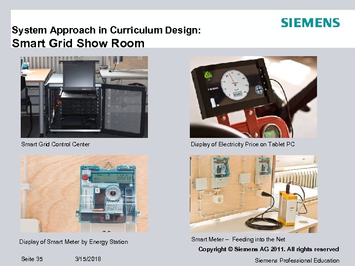 System Approach in Curriculum Design: Smart Grid Show Room Smart Grid Control Center Display of Smart Meter by Energy Station Display of Electricity Price on Tablet PC Smart Meter – Feeding into the Net Copyright © Siemens AG 2011. All rights reserved Seite 35 3/15/2018 Siemens Professional Education