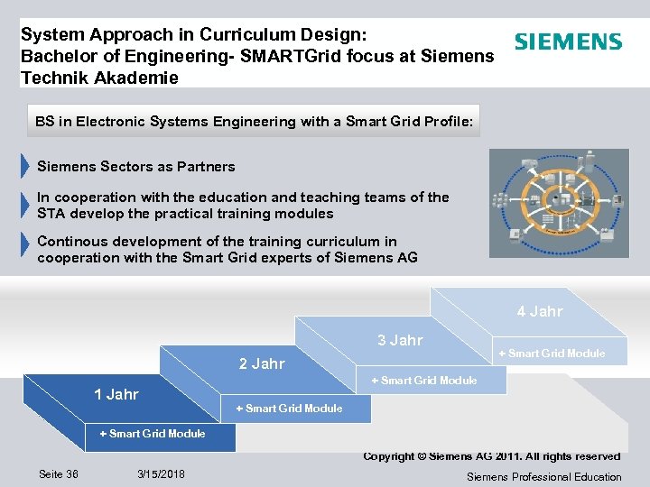 System Approach in Curriculum Design: Bachelor of Engineering- SMARTGrid focus at Siemens Technik Akademie BS in Electronic Systems Engineering with a Smart Grid Profile: Siemens Sectors as Partners In cooperation with the education and teaching teams of the STA develop the practical training modules Continous development of the training curriculum in cooperation with the Smart Grid experts of Siemens AG 4 Jahr 3 Jahr + Smart Grid Module 2 Jahr 1 Jahr + Smart Grid Module Copyright © Siemens AG 2011. All rights reserved Seite 36 3/15/2018 Siemens Professional Education