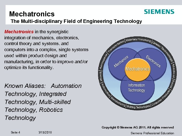 Mechatronics The Multi-disciplinary Field of Engineering Technology Mechatronics in the synergistic integration of mechanics, electronics, control theory and systems. and computers into a complex, single systems used within product design and manufacturing, in order to improve and/or optimize its functionality. Known Aliases: Automation Technology, Integrated Technology, Multi-skilled Technology, Robotics Technology Copyright © Siemens AG 2011. All rights reserved Seite 4 3/15/2018 Siemens Professional Education