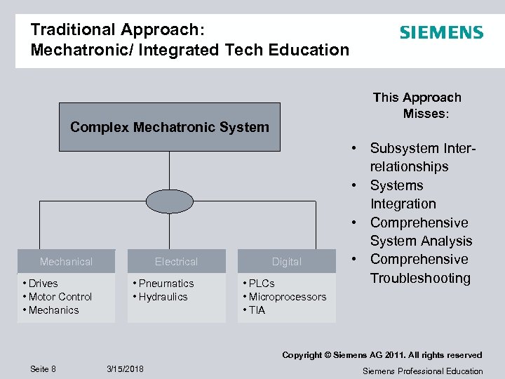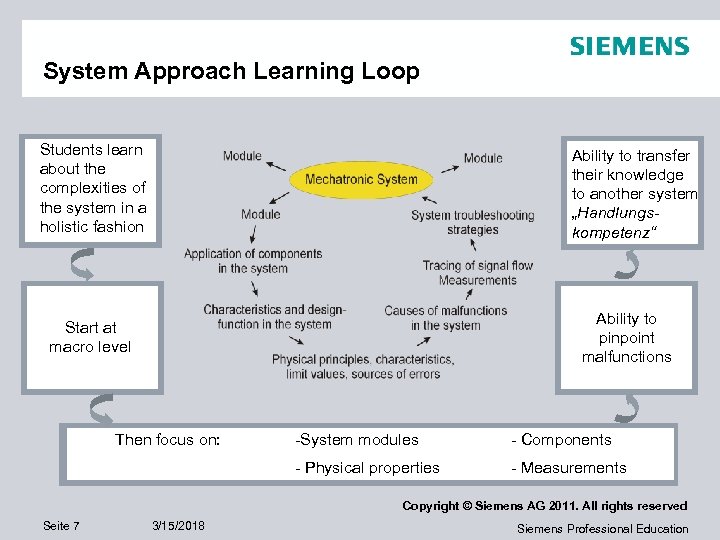 System Approach Learning Loop Students learn about the complexities of the system in a holistic fashion Ability to transfer their knowledge to another system „Handlungskompetenz“ Ability to pinpoint malfunctions Start at macro level Then focus on: -System modules - Components - Physical properties - Measurements Copyright © Siemens AG 2011. All rights reserved Seite 7 3/15/2018 Siemens Professional Education