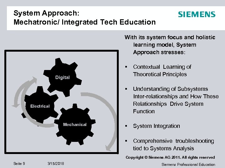 Traditional Approach: Mechatronic/ Integrated Tech Education This Approach Misses: Complex Mechatronic System Mechanical • Drives • Motor Control • Mechanics Electrical • Pneumatics • Hydraulics Digital • PLCs • Microprocessors • TIA • Subsystem Interrelationships • Systems Integration • Comprehensive System Analysis • Comprehensive Troubleshooting Copyright © Siemens AG 2011. All rights reserved Seite 8 3/15/2018 Siemens Professional Education