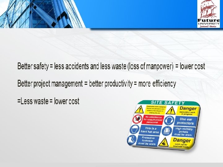 • General site safety rules Access/egress arrangements Materials Working at height Excavations Fire prevention