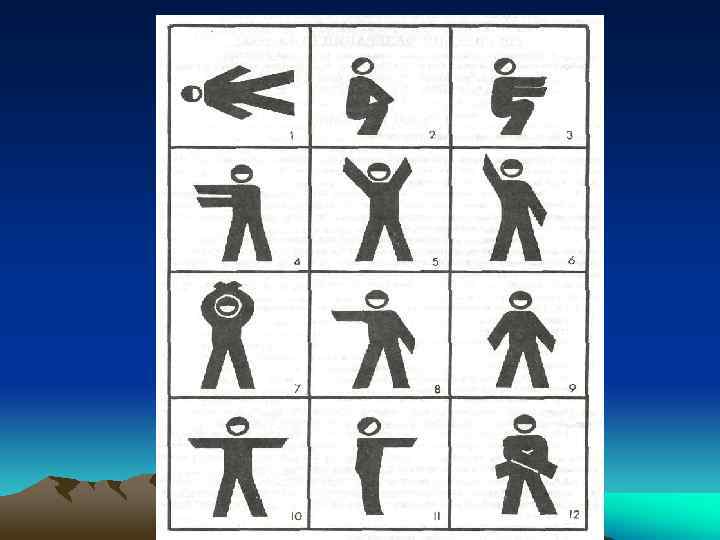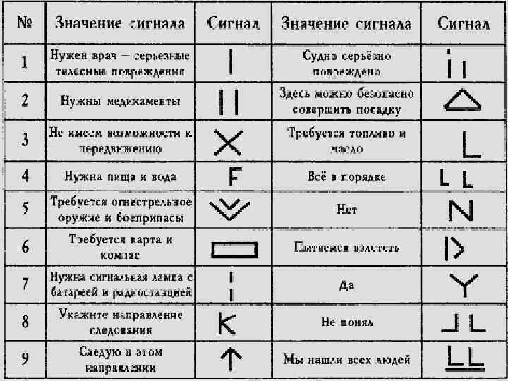 9. Требуются карта и компас- Стоящая в полный рост фигура человека, руки опущены вниз вдоль туловища 10. Утеряно, пришло в негодность специальное снаряжение (веревки, крючья, карабины и т. д. в зависимости от вида туризма- Стоящая в полный рост фигура человека, обе руки на уровне плеч вытянуты в стороны 11. Нужны медикаменты- Стоящая в полный рост фигура человека, одна из рук на уровне плеч вытянута вперед 12. Нужна радиостанция, питание к ней- Стоящая в полный рост фигура человека, руки опущены вниз и сложены