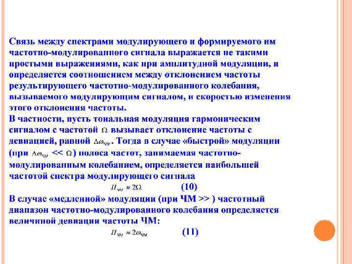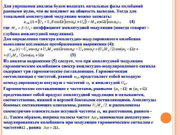 ПОДОБНЫЙ ПОДХОД МОЖНО ПРИМЕНИТЬ И К АНАЛИЗУ АМПЛИТУДНОМОДУЛИРОВАННЫХ КОЛЕБАНИЙ СЛОЖНОЙ ФОРМЫ. В ЭТОМ СЛУЧАЕ ПЕРИОДИЧЕСКИЙ МОДУЛИРУЮЩИЙ СИГНАЛ МОЖЕТ БЫТЬ ПРЕДСТАВЛЕН НАБОРОМ ГАРМОНИЧЕСКИХ СОСТАВЛЯЮЩИХ, ЧАСТОТА КОТОРЫХ КРАТНА ПЕРИОДУ ИСХОДНОГО СИГНАЛА. КАЖДАЯ ИЗ ГАРМОНИК МОДУЛИРУЮЩЕГО СИГНАЛА СФОРМИРУЕТ В СПЕКТРЕ АМПЛИТУДНО-МОДУЛИРОВАННОГО КОЛЕБАНИЯ ДВЕ БОКОВЫЕ СОСТАВЛЯЮЩИЕ, СИММЕТРИЧНО ОТСТОЯЩИЕ ОТ НЕСУЩЕЙ НА ВЕЛИЧИНУ, РАВНУЮ ЧАСТОТЕ СООТВЕТСТВУЮЩЕЙ ГАРМОНИКИ. ДЛЯ ПРИМЕРА, ЕСЛИ СПЕКТР МОДУЛИРУЮЩЕГО СИГНАЛА ИМЕЕТ ВИД, ПРЕДСТАВЛЕННЫЙ НА РИСУНКЕ 3(А), ТО СПЕКТР АМПЛИТУДНОМОДУЛИРОВАННОГО КОЛЕБАНИЯ МОЖЕТ БЫТЬ ПРЕДСТАВЛЕН ДИАГРАММОЙ, ПРИВЕДЕННОЙ НА РИСУНКЕ 3(Б). Рис. 3 Спектры сигналов: а) модулирующего сигнала; б) амплитудно-модулированного колебания
