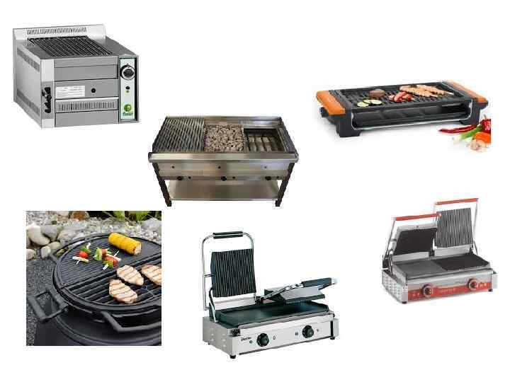 GRILIAI – PRODUKTŲ SKRUDINTUVAI • Tai kaitinimo paviršiai, kurie įkaista iki 250300ºC. • Kepama be riebalų (mėsa, dešrelės, vištienos gabalėliai ir kt. ) • Kepamas produktas gali būti patalpinamas tarp dviejų kepimo paviršių.