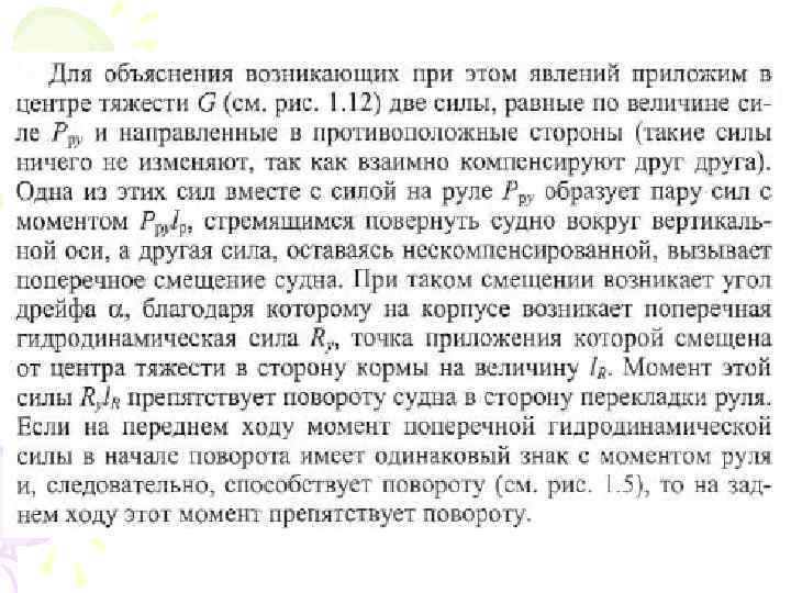 Влияние гребного винта и руля на управляемость судна • Рассмотрим качественную сторону этого влияния при совместной работе винта и руля при различных ходах и положениях пера руля. • Судно неподвижно относительно воды. Перо руля находится в диаметральной плоскости. Как только машине будет дан ход вперед и винт начнет вращаться, нос судна вначале будет незначительно уклоняться влево. Объяснить это можно тем, что при малых оборотах винт своими развернутыми лопастями как бы загребает воду и забрасывает корму вправо, а нос идет влево. • По мере увеличения оборотов винта нос судна установится на первоначальный курс и затем уклонится вправо. Происходит это потому, что при работе винт набрасывает воду на перо руля, причем струя воды, набрасываемая винтом на нижнюю часть руля, создает гидродинамическое давление, которое уклоняет корму влево, а нос — вправо. Следовательно, при работе винта правого шага вперед, при положении «прямо руль» , нос судна в конечном итоге уклоняется в сторону вращения винта. • Судно имеет ход вперед, винт работает назад. Руль прямо. Винт одновинтового судна, начавший вращаться на задний ход, своими развернутыми лопастями как бы загребает воду с левой стороны, обтекает правый борт и, оказывая на него давление, заставляет корму разворачиваться влево, а нос — вправо. • Судно имеет ход назад, винт работает назад. До тех пор, пока судно не приобретет достаточную скорость заднего хода, положение пера руля на поворотливость судна влияния не оказывает. Как отмечалось ранее, на поведение судна оказывает влияние струя воды от винта, направленная в правую часть обводов корпуса, вследствие чего нос судна идет вправо. Как только судно разовьет определенную скорость заднего хода и перо руля будет находиться в массе встречного потока воды, образованного движением суд-на, положение пера может заставить судно пойти кормой в сторону переложенного руля. В этом случае на руль будут действовать две силы: сила встречной воды, возникающая от движения судна назад, и сила всасываемой струи, порождаемая засасывающим действием винта при его работе на задний ход. Одновинтовые суда слушаются руля на заднем ходу лучше, когда винт не работает и судно движется назад с наибольшей скоростью. Однако рассчитывать на непогрешимость работы руля одновинтового судна на заднем ходу (особенно для поворота носа судна влево) можно только в штилевую