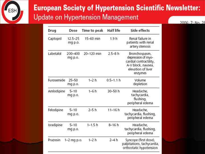 JNC VII 2003 Препараты Дозы Начало Продолжит действия Нитропруссид 0, 25 -10 мкг/кг/м Мгновенно 1 -2 мин Никардипин Фенодопам Нитроглицерин 5 -15 мг/ч в/в 0, 1 -0, 3 мкг/кг 1’ 5 -100 мкг/мин 5 -15 мин 2 -5 мин 15 -30 мин 5 -10 мин Эналаприлат 1, 25 -5 мг в/в 15 -30 мин 6 -12 час 10 -20 мин Гидралазин Лабетолол Эсмолол 5 -15 мг в/в ОЛЖН, кроме ИМ 5 -10 мин 1 -2 мин Эклампсия 3 -6 час 10 -30 мин Кроме ОЛЖН Расл аневризма аорты 10 -30 мин Феохромоцитома 1 -2 мин Фентоламин Повышенное внутри мозговое давл. , азотемия Кроме ОСН Особенно с глаукомой ОКС 1 -2 часа 10 -20 мг в/в 20 -80 мг в/в 50 -100 мкг/кг/м Показания