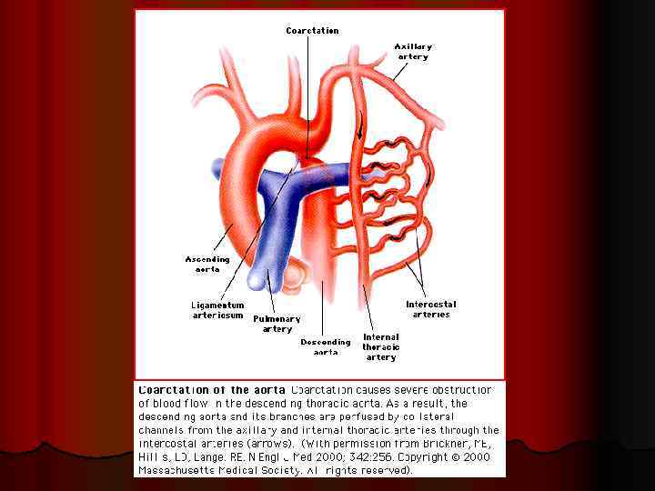 КОАРКТАЦИЯ АОРТЫ диагностика: аортография l лечение: хирургическая коррекция или ангиопластика l медикаментозное лечение – ингибиторы АПФ, антагонисты кальция l без хирургической коррекции 80 % больных умирают от осложнений АГ. В большинстве случаев смерть наступает на 2 -4 м десятилетии жизни от поражения сердца (50%), внутричерепных кровоизлияний (спонтанных или вызванных разрывом аневризмы церебральных артерий (13%) или разрыва аорты (>20%) l
