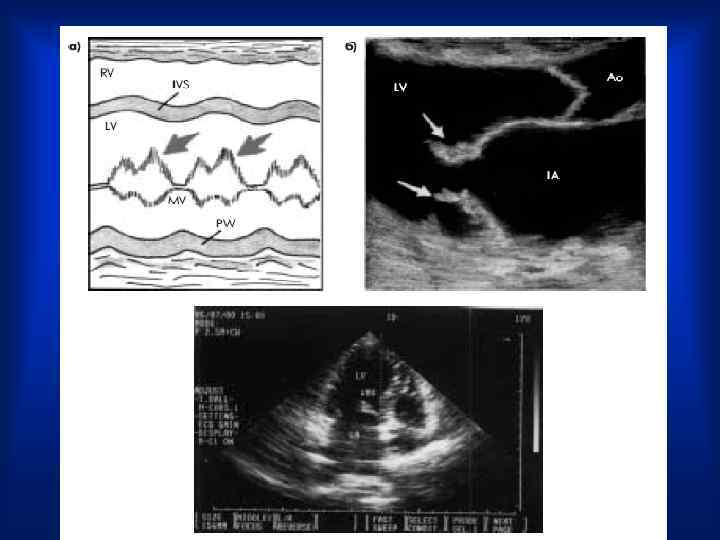 Эхокардиография • Эхо. КГ— вегетации на клапанах, если их размеры превышают 2– 3 мм. . Вегетации обнаруживаются в виде множества дополнительных эхосигналов, как бы «размывающих» изображение движущихся створок клапана ( «лохматые» створки).