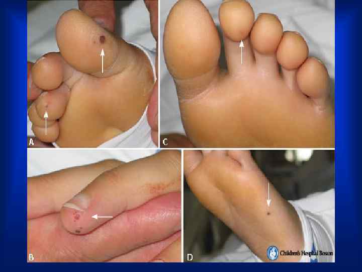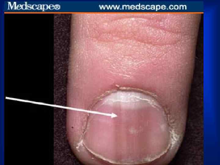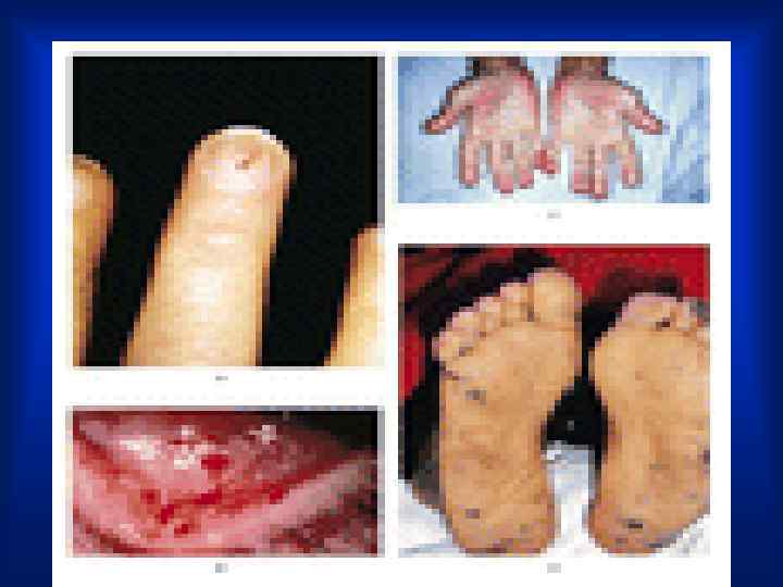 ОСМОТР • · Пятна Рота — мелкие кровоизлияния в сетчатку глаза, имеющие в центре зону побледнения, выявляются при исследовании глазного дна. • Линейные геморрагии под ногтями. • · Узелки Ослера — болезненные красноватые напряженные образования размером с горошину, в коже и подкожной клетчатке на ладонях, пальцах, подошвах, воспалительные инфильтраты, тромбоваскулит или эмболии в мелкие сосуды. .