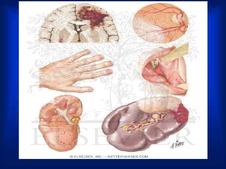 Тромбоэмболии в артериальном сосудистом русле легких, головного мозга, кишечника, селезенки и других органов. • Сочетание этих патологических изменений определяет клиническую картину ИЭ.