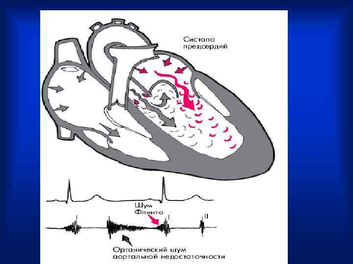 Функциональные шумы • Систолический шум на верхушке -при большом расширении ЛЖ возникает относительная недостаточность митрального клапана. • Диастолический, пресистолический шум – шум Флинта (возникает вследствие того, что обратный ток крови во время диастолы из аорты в желудочек оттесняет аортальную створку митрального клапана, что создает функциональный стеноз митрального отверстия, и во время диастолы создается препятствие току крови из левого предсердия в желудочек).