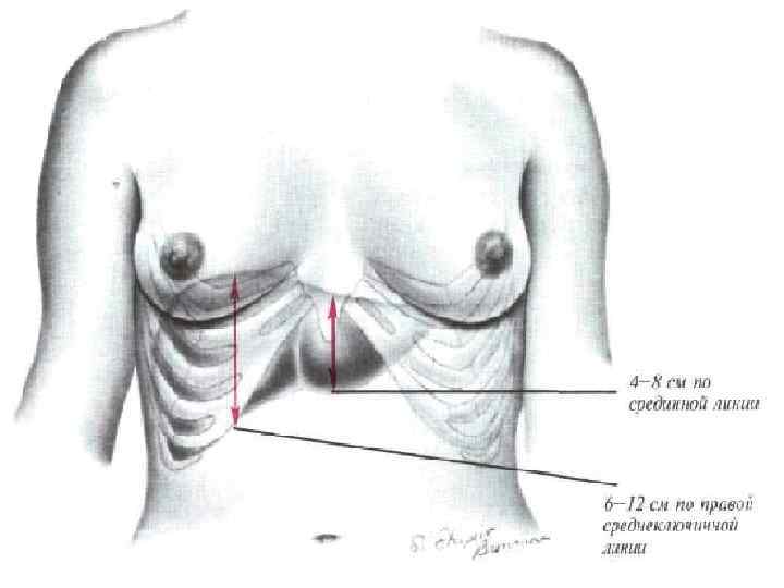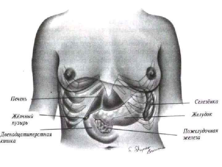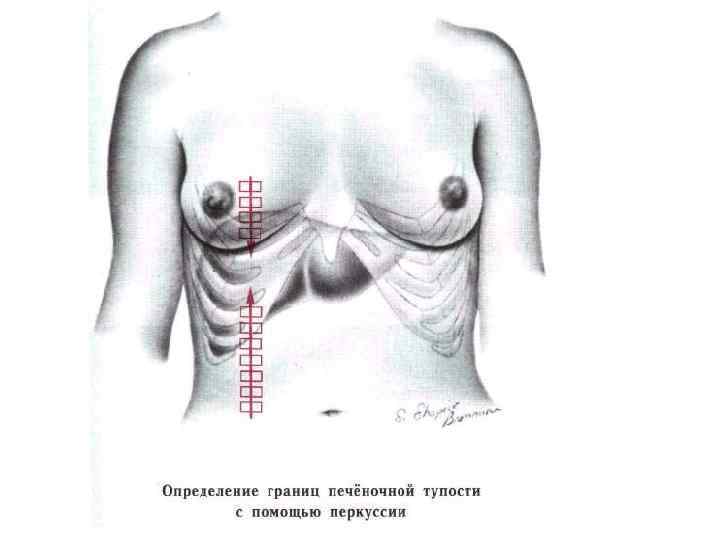 На вдохе печень на 4 см выходит из-под края рёберной дуги по среднеключичной линии