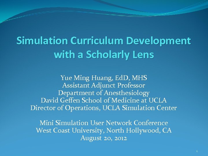 Simulation Curriculum Development with a Scholarly Lens Yue Ming Huang, Ed. D, MHS Assistant Adjunct Professor Department of Anesthesiology David Geffen School of Medicine at UCLA Director of Operations, UCLA Simulation Center Mini Simulation User Network Conference West Coast University, North Hollywood, CA August 20, 2012 1