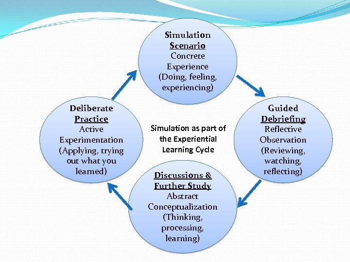 Simulation Scenario Concrete Experience (Doing, feeling, experiencing) Deliberate Practice Active Experimentation (Applying, trying out what you learned) Simulation as part of the Experiential Learning Cycle Discussions & Further Study Abstract Conceptualization (Thinking, processing, learning) Guided Debriefing Reflective Observation (Reviewing, watching, reflecting)