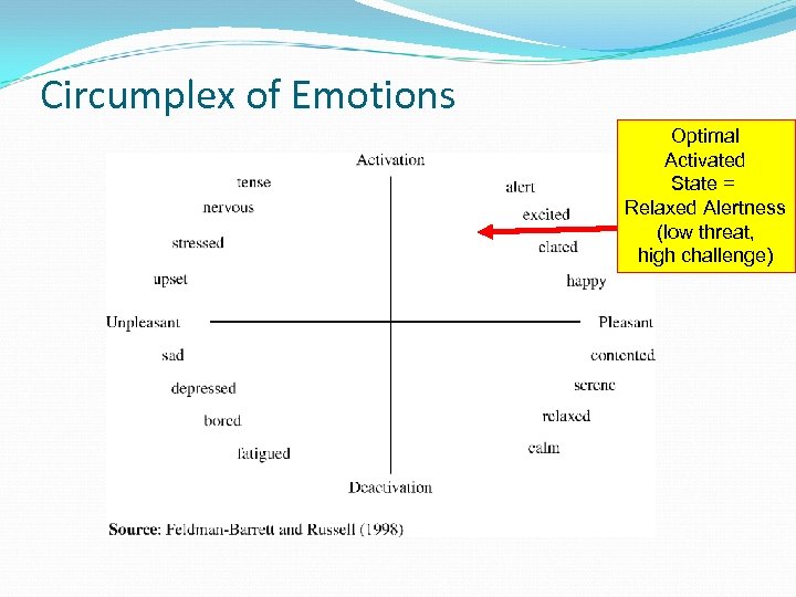 Circumplex of Emotions Optimal Activated State = Relaxed Alertness (low threat, high challenge)
