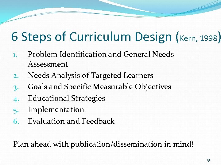 6 Steps of Curriculum Design (Kern, 1998) 1. 2. 3. 4. 5. 6. Problem Identification and General Needs Assessment Needs Analysis of Targeted Learners Goals and Specific Measurable Objectives Educational Strategies Implementation Evaluation and Feedback Plan ahead with publication/dissemination in mind! 13