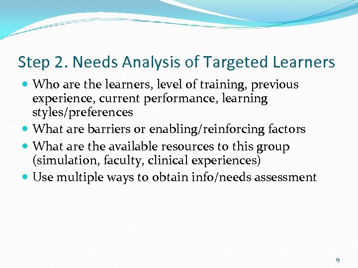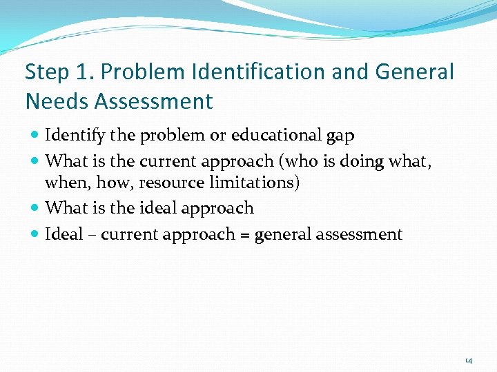 Step 1. Problem Identification and General Needs Assessment Identify the problem or educational gap What is the current approach (who is doing what, when, how, resource limitations) What is the ideal approach Ideal – current approach = general assessment 14