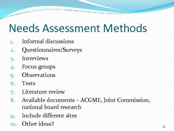 Needs Assessment Methods Informal discussions Questionnaires/Surveys Interviews Focus groups Observations Tests Literature review Available documents – ACGME, Joint Commission, national board research 9. Include different sites 10. Other ideas? 1. 2. 3. 4. 5. 6. 7. 8. 16