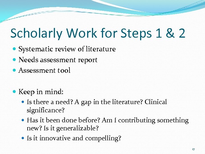 Scholarly Work for Steps 1 & 2 Systematic review of literature Needs assessment report Assessment tool Keep in mind: Is there a need? A gap in the literature? Clinical significance? Has it been done before? Am I contributing something new? Is it generalizable? Is it innovative and compelling? 17