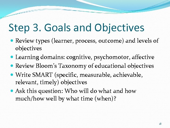 Step 3. Goals and Objectives Review types (learner, process, outcome) and levels of objectives Learning domains: cognitive, psychomotor, affective Review Bloom’s Taxonomy of educational objectives Write SMART (specific, measurable, achievable, relevant, timely) objectives Ask this question: Who will do what and how much/how well by what time (when)? 18