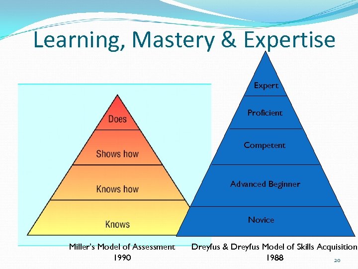 Learning, Mastery & Expertise Expert Proficient Competent Advanced Beginner Novice Miller’s Model of Assessment 1990 Dreyfus & Dreyfus Model of Skills Acquisition 1988 20