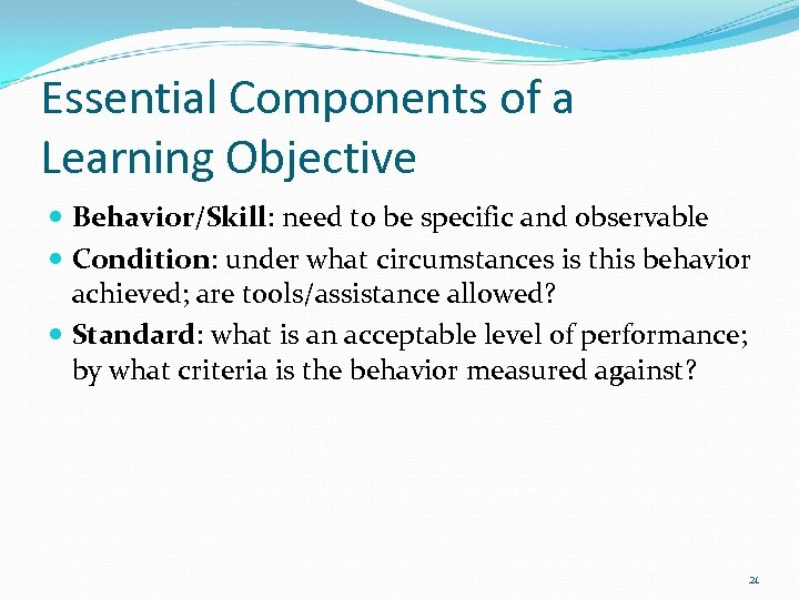 Essential Components of a Learning Objective Behavior/Skill: need to be specific and observable Condition: under what circumstances is this behavior achieved; are tools/assistance allowed? Standard: what is an acceptable level of performance; by what criteria is the behavior measured against? 21