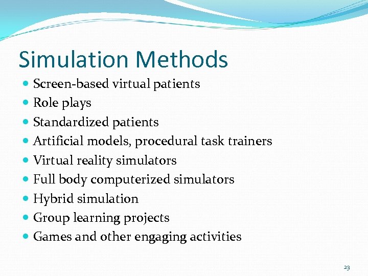 Simulation Methods Screen-based virtual patients Role plays Standardized patients Artificial models, procedural task trainers Virtual reality simulators Full body computerized simulators Hybrid simulation Group learning projects Games and other engaging activities 23