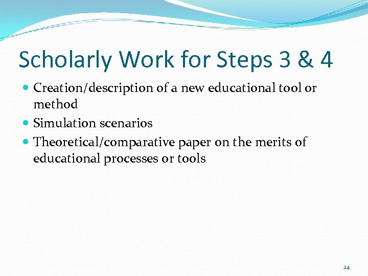 Scholarly Work for Steps 3 & 4 Creation/description of a new educational tool or method Simulation scenarios Theoretical/comparative paper on the merits of educational processes or tools 24